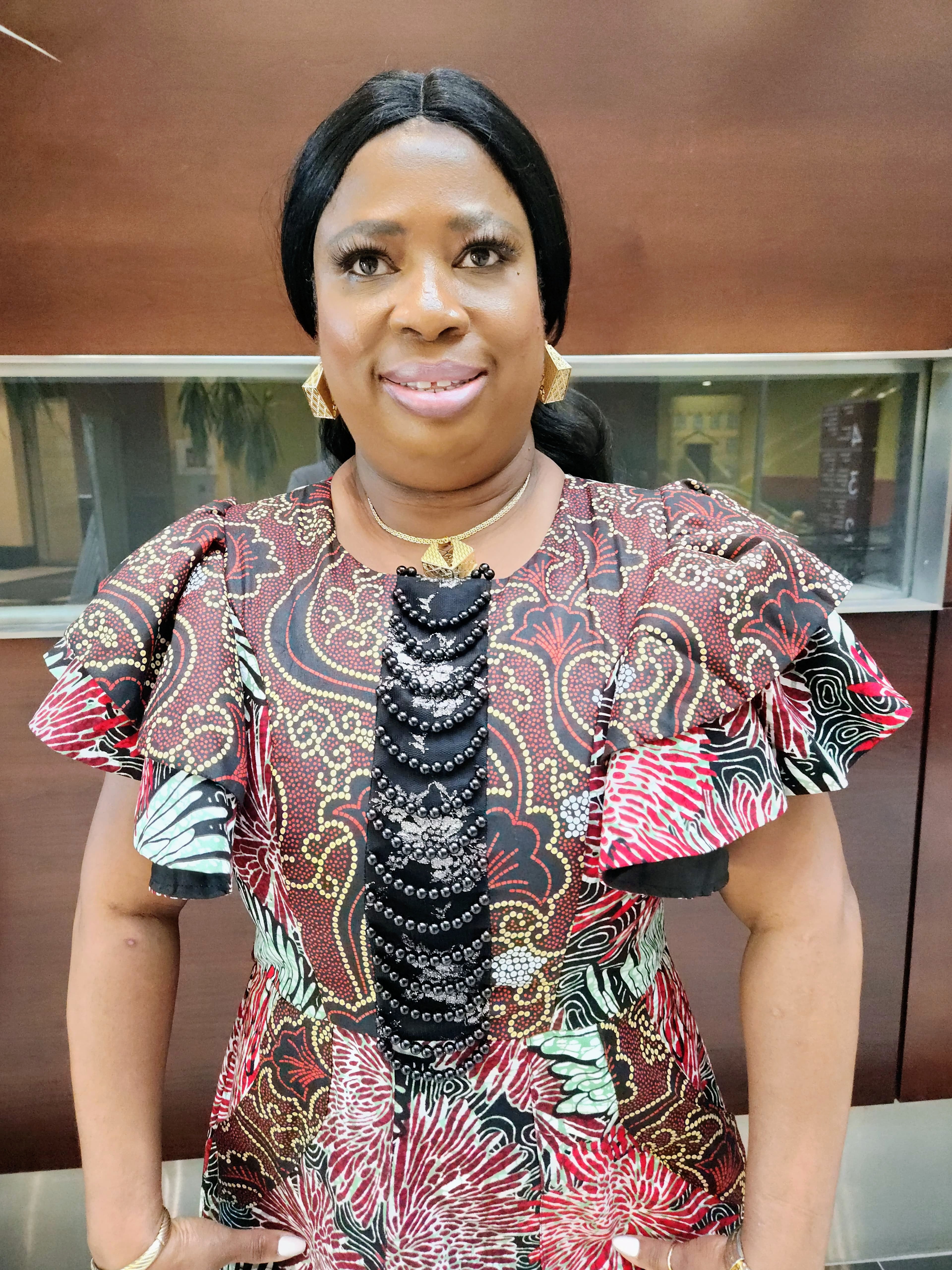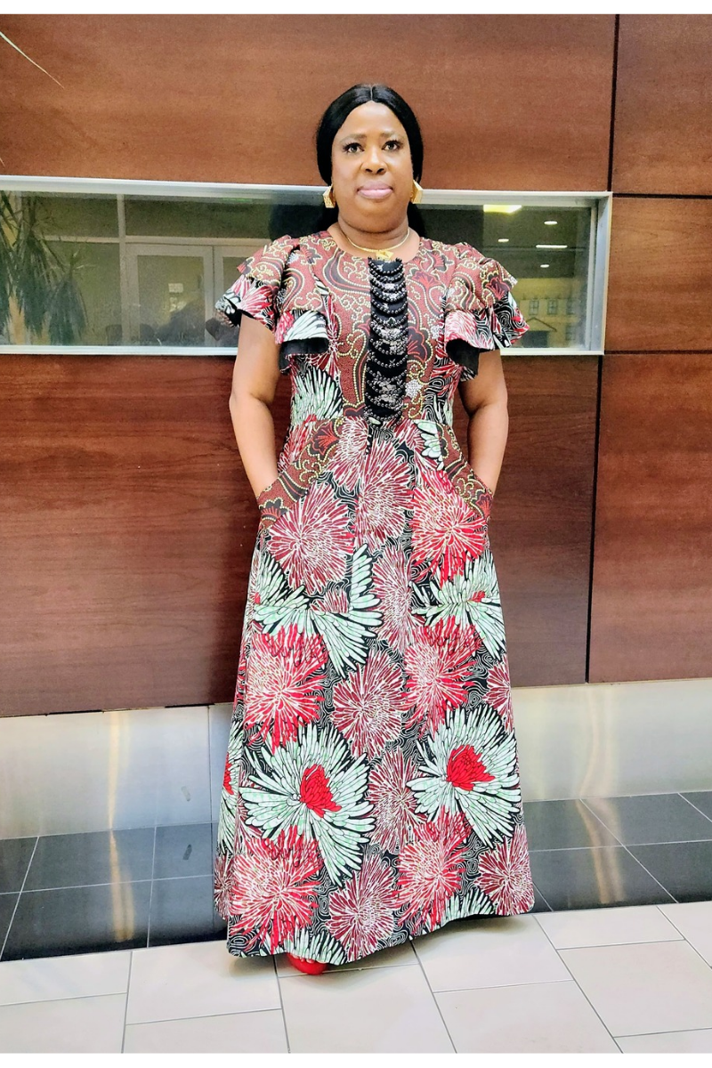 A striking two-tone Ankara combination defines the layered sleeves, bust panel, and side panels, while delicate Golden Thread detailing enhances the bodice. The look is completed with two front pockets trimmed in contrast Ankara for both style and function. Cascading black beads down the front to the waist add a refined finish, making this dress versatile enough for casual outings, semi-formal occasions, or special events.