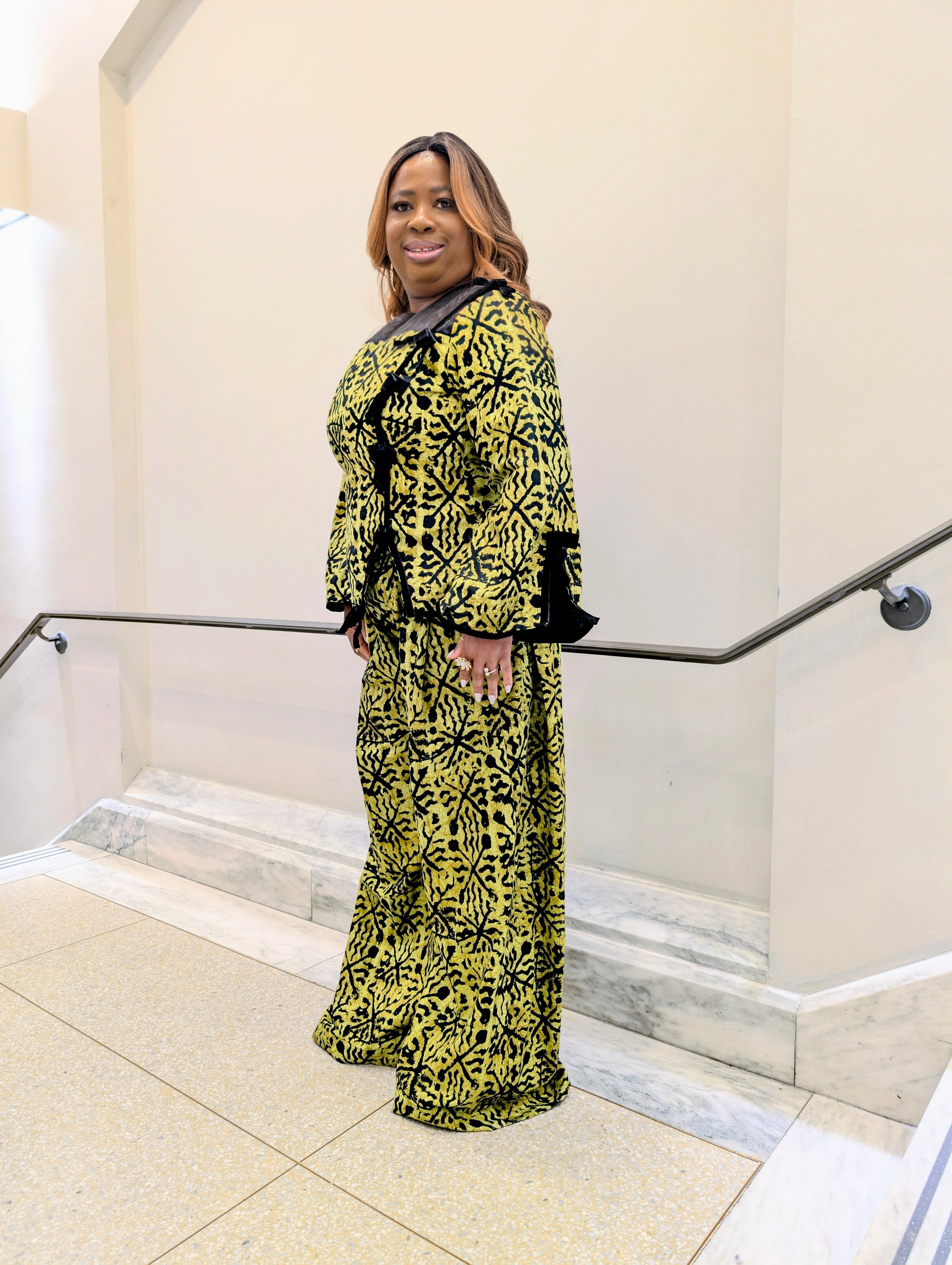 A striking 2-piece pants set made from 100% cotton Adire in lemon and black (mustard undertone). The 45" palazzo pants feature kissing pleats on each side of the pocket, with an elastic waist and rope tie for adjustable comfort. The long-sleeve blouse adds bold detailing with side openings trimmed in black velvet ribbons, a velvet ribbon accent running from shoulder to hem, black organza on the front shoulder, and a back zipper for a tailored finish. This set blends modern elegance with cultural artistry — perfect for standout occasions.